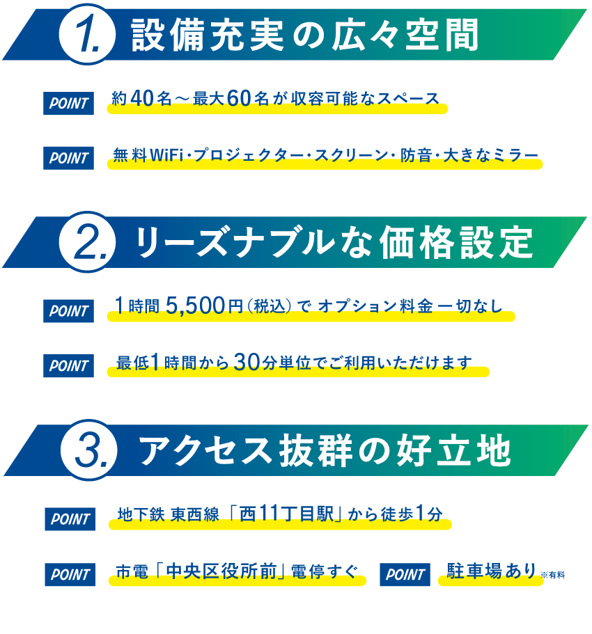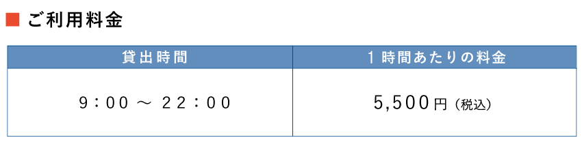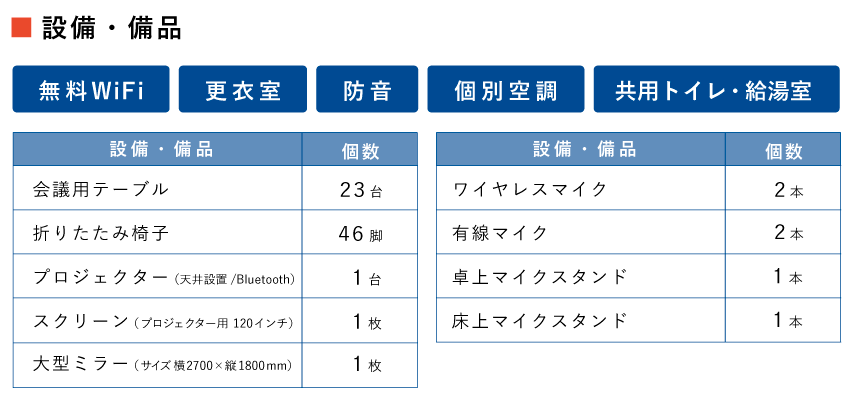 テーブルや椅子はもちろん、無料WiFi・プロジェクター・スクリーン(120インチ)・マイクなどの設備も充実。追加料金もかからずすべて無料でご利用いただけます。