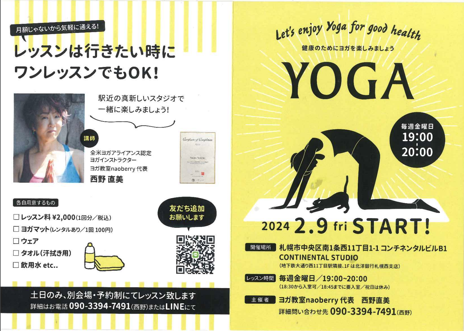 「健康のためにヨガを楽しみましょう」というテーマで、行きたい時にワンレッスンから参加できるヨガ教室。月額ではなく参加しやすい気軽さも魅力です。全米ヨガアライアンス認定ヨガインストラクターの資格を持ち、ヨガ教室naoberry代表の西野直美さんが講師をされています。コンチネンタルスタジオをご利用いただき開催されたレッスンの様子を特別に撮影させていただきました。