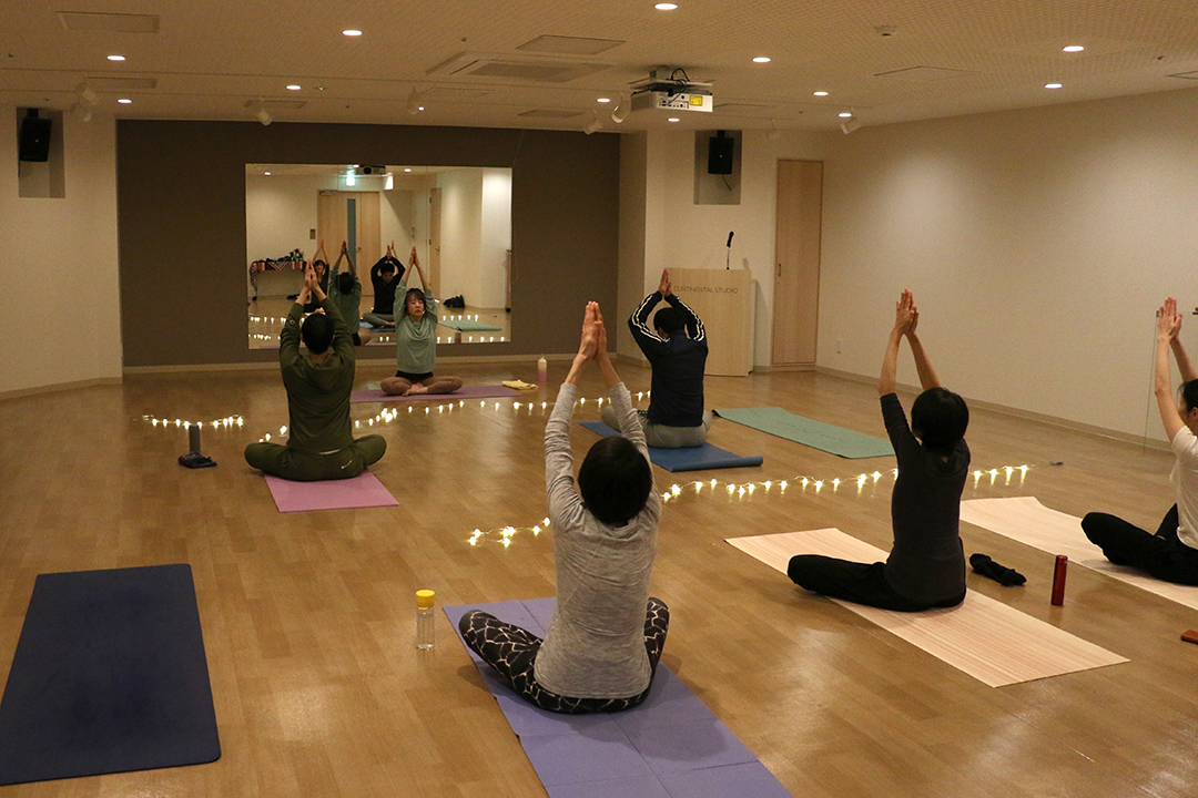 照明はご利用目的に合わせて自由に調整いただけます。今回は夜の時間帯のヨガにピッタリの落ち着いた光量でご利用いただいています。お持ち込みの装飾演出がとても良い雰囲気で素敵です。